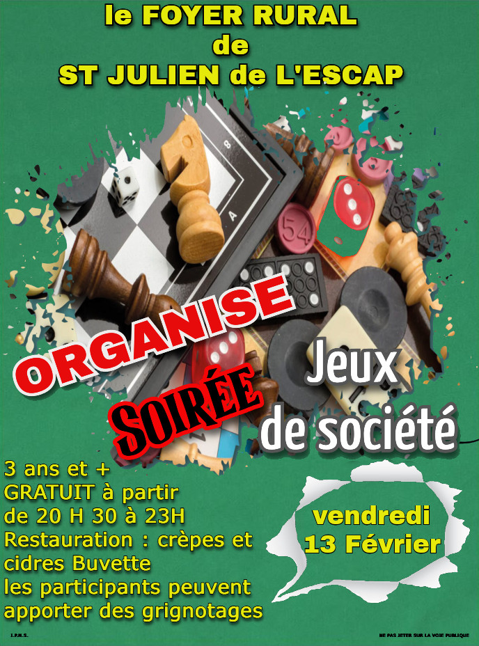 Sur place : buvette, cidre, crêpe. Une partie de tarot, de belote ou tout autre jeu de votre choix. Ouvert à toute génération. Suite à l'édition de janvier appréciée des participants nous avons décidé de renouveler l'évènement pour passe une excellent soirée.