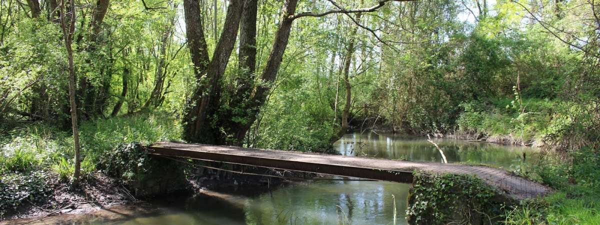 2 - S’approcher à droite de la Vrignolle. Tourner à gauche entre les maisons (rue des Sources) puis prendre la rue du Pied de Bien. Prendre à droite entre les vignes. Suivre une petite route à gauche sur 50 m et emprunter le premier chemin à droite. Franchir le ruisseau de la Vrignolle et prendre un chemin plein nord.